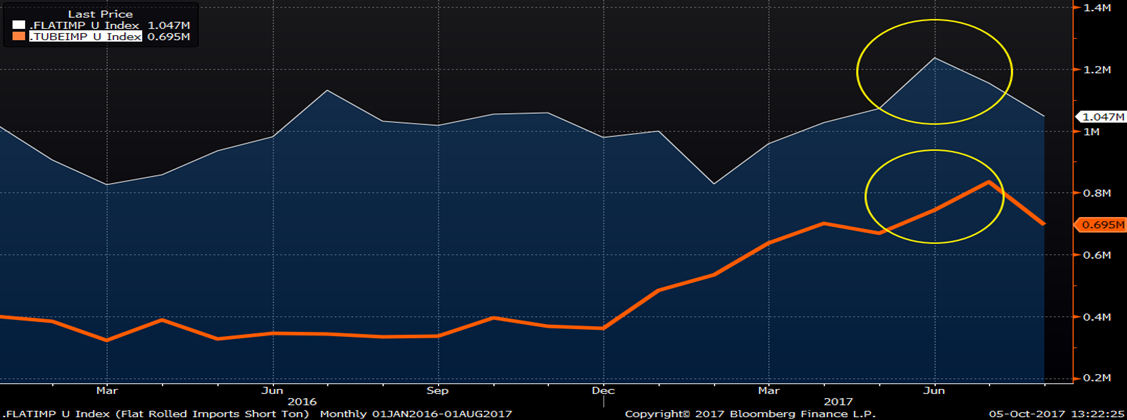So far, the effect of this investigation looks to have been a sharp increase in imported flat rolled and tube products (see below) and perhaps a demand pull forward from buyers attempting to hedge policy risk.