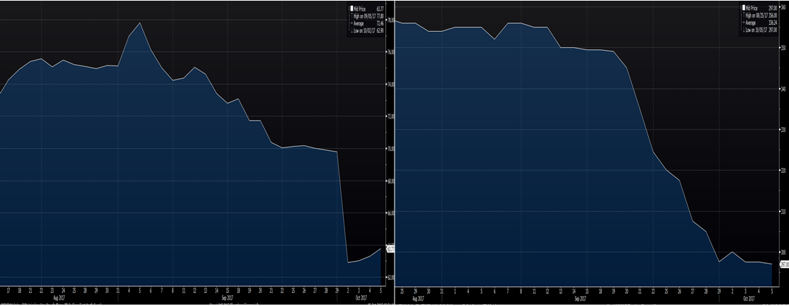 In addition to this increase in supply, raw material prices have been falling hard and fast in recent weeks. The front month iron ore future is down 18 percent to $63.77/t from a high of $77.8/t on Sept. 5, while the Platts TSI Turkish Scrap index has fallen 16 percent to $297.50 from a high of $356/t on August 18.