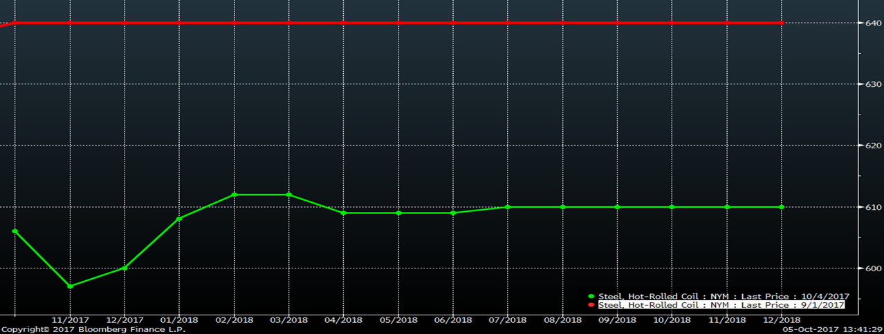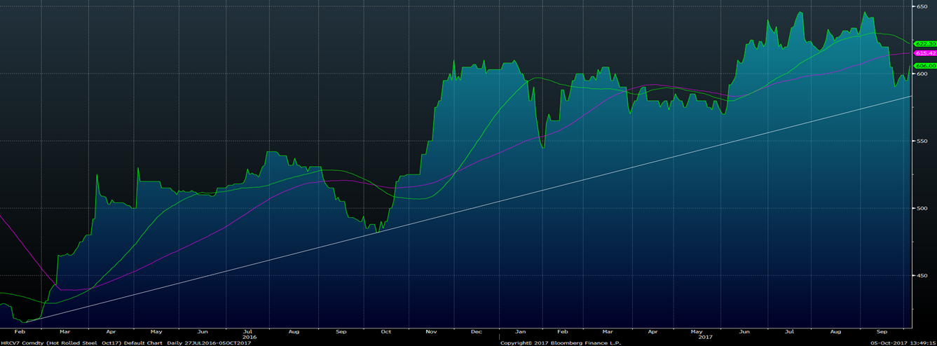 The increase in imports, the demand pull forward and falling raw materials have pressured HRC prices lower since early September. CME HRC futures have fallen $30-40/st from $640 on Sept. 1 to the $600 – $610 range as of Wednesday night’s settlements.