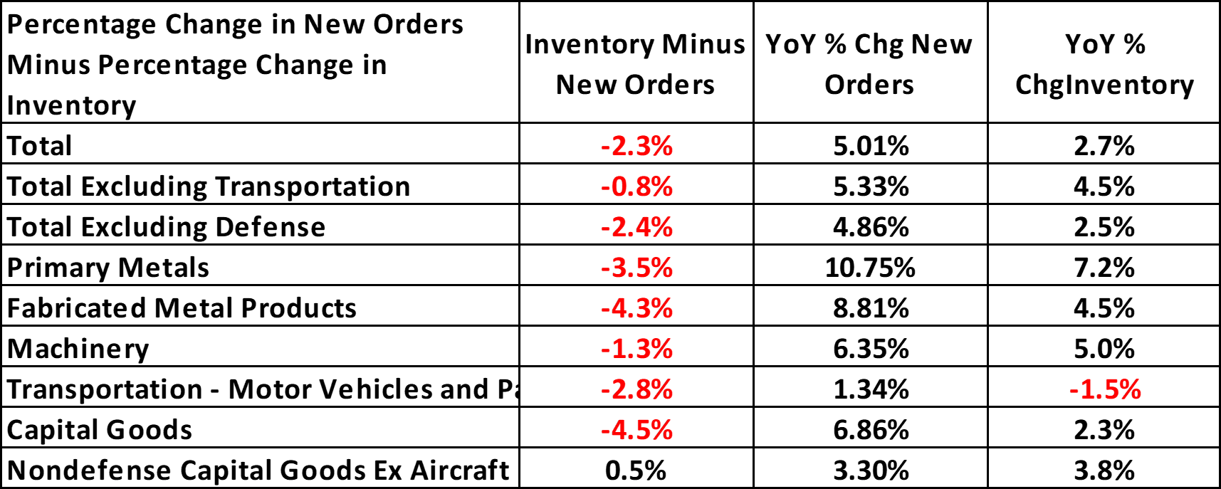This table takes the YoY percentage change in nominal unadjusted U.S. dollars for inventory and subtracts the YoY percentage change in nominal unadjusted U.S. dollars for new orders. As you can see, almost every category is in need of replacing inventory sold on new orders. In other words, while inventory has increased YoY, inventory hasn’t increased by enough to replace all of the goods sold.