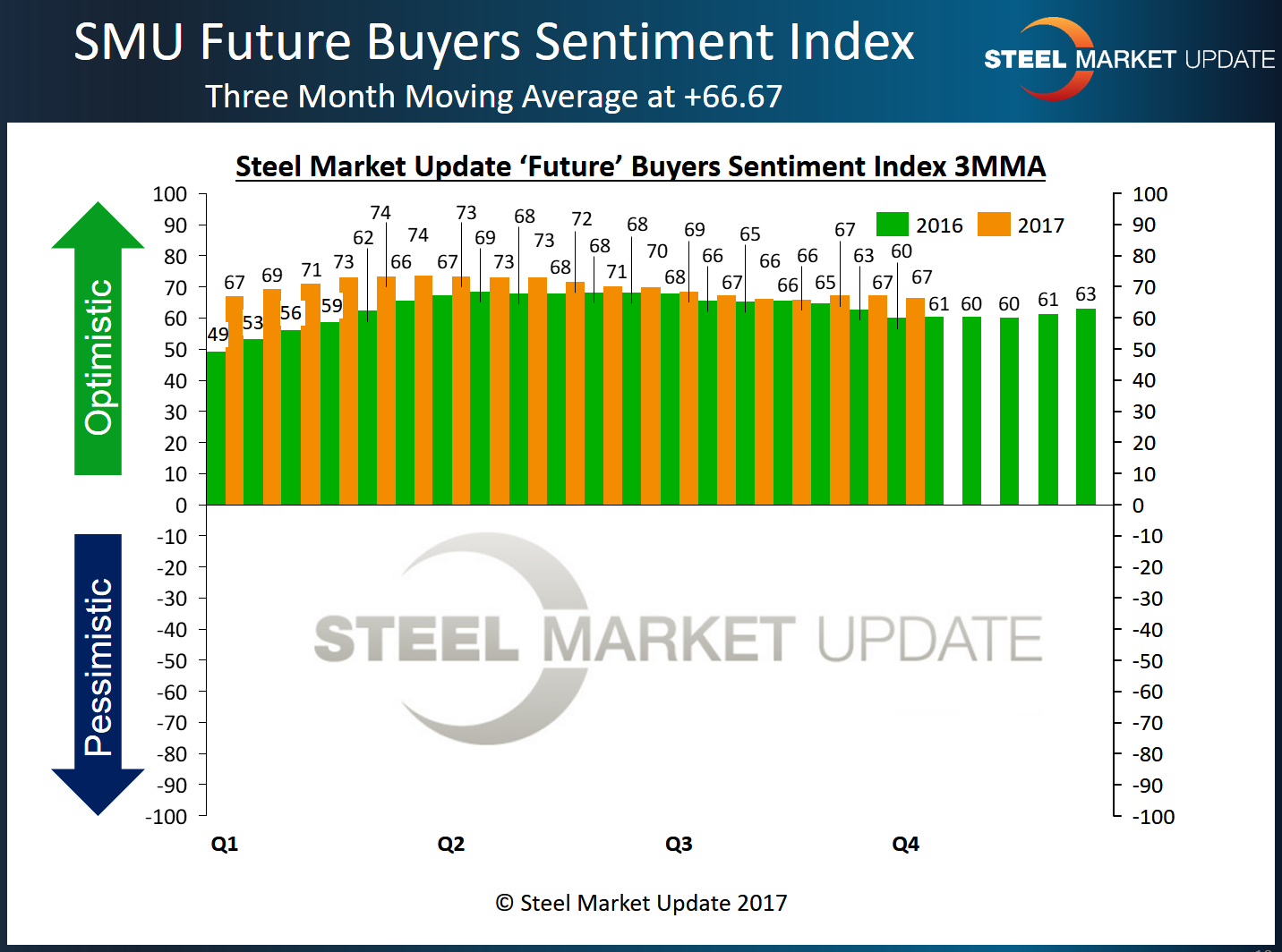 Buyers and sellers of flat rolled steel continue to be optimistic about their company’s ability to be successful in the current market environment as well as three to six months into the future. We are seeing signs of what has become a normal mild tapering of enthusiasm as we enter the fourth quarter of the year. This can clearly been seen when comparing the three-month moving average (3MMA) for both this year and last (see below graphic). However, the highs were higher this year and the lows that we are seeing at this moment are well above year ago levels.