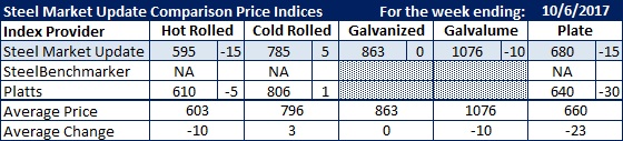 Plate prices fell on both Platts (-$30) and SMU (-$15). The SMU number includes freight while the Platts average is based on being priced FOB Southeastern USA Mill.