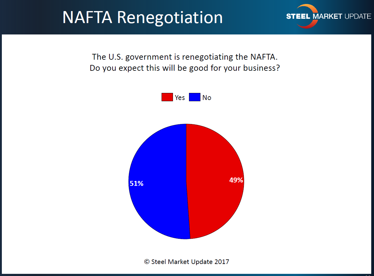 Steel buyers and sellers appear evenly split on whether the renegotiation of NAFTA will benefit their companies. Responses to Steel Market Update’s market trends questionnaire, emailed to several hundred steel executives earlier this week, suggests that most companies don’t really know if the new NAFTA being pursued by the Trump administration will be good for their businesses.