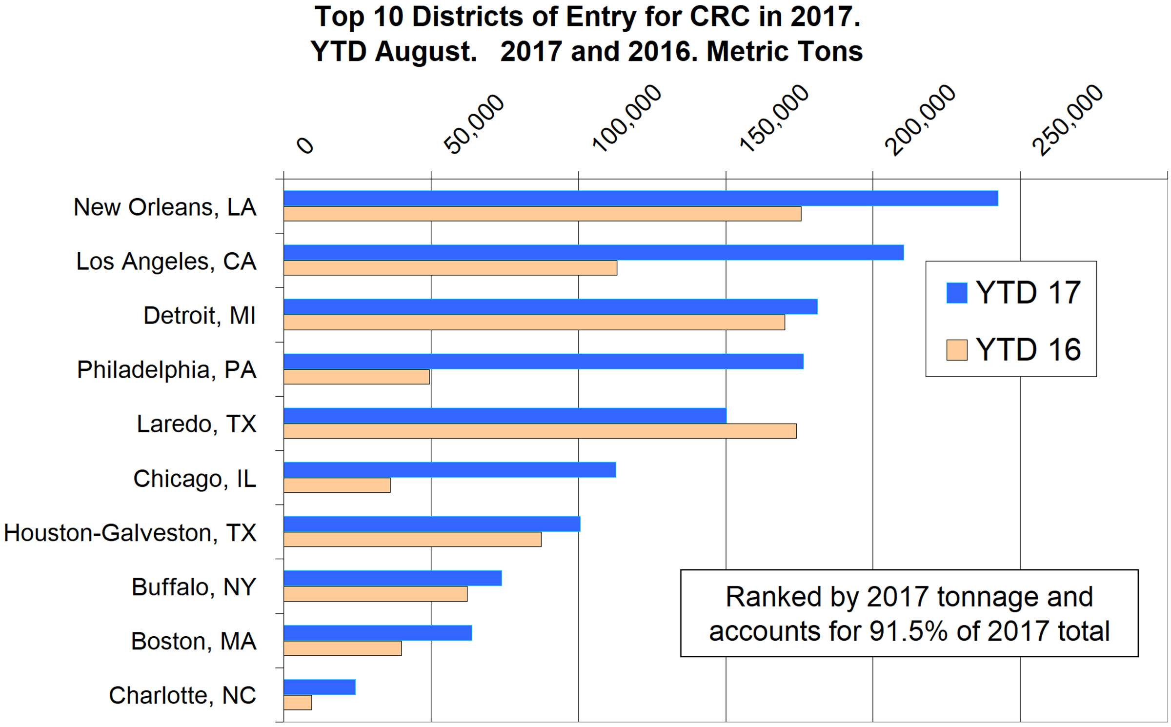 The table included here (click to enlarge) is a small part of the detailed analysis of the CRC tonnage data. The bar graph shows the tonnage of CRC that entered the top 10 districts in YTD August for 2016 and 2017 and is ranked by 2017 tonnage. These 10 districts account for 91.5 percent of the grand total in 2017. New Orleans received the most tonnage through August 2017, followed by Los Angeles, Detroit and Philadelphia.