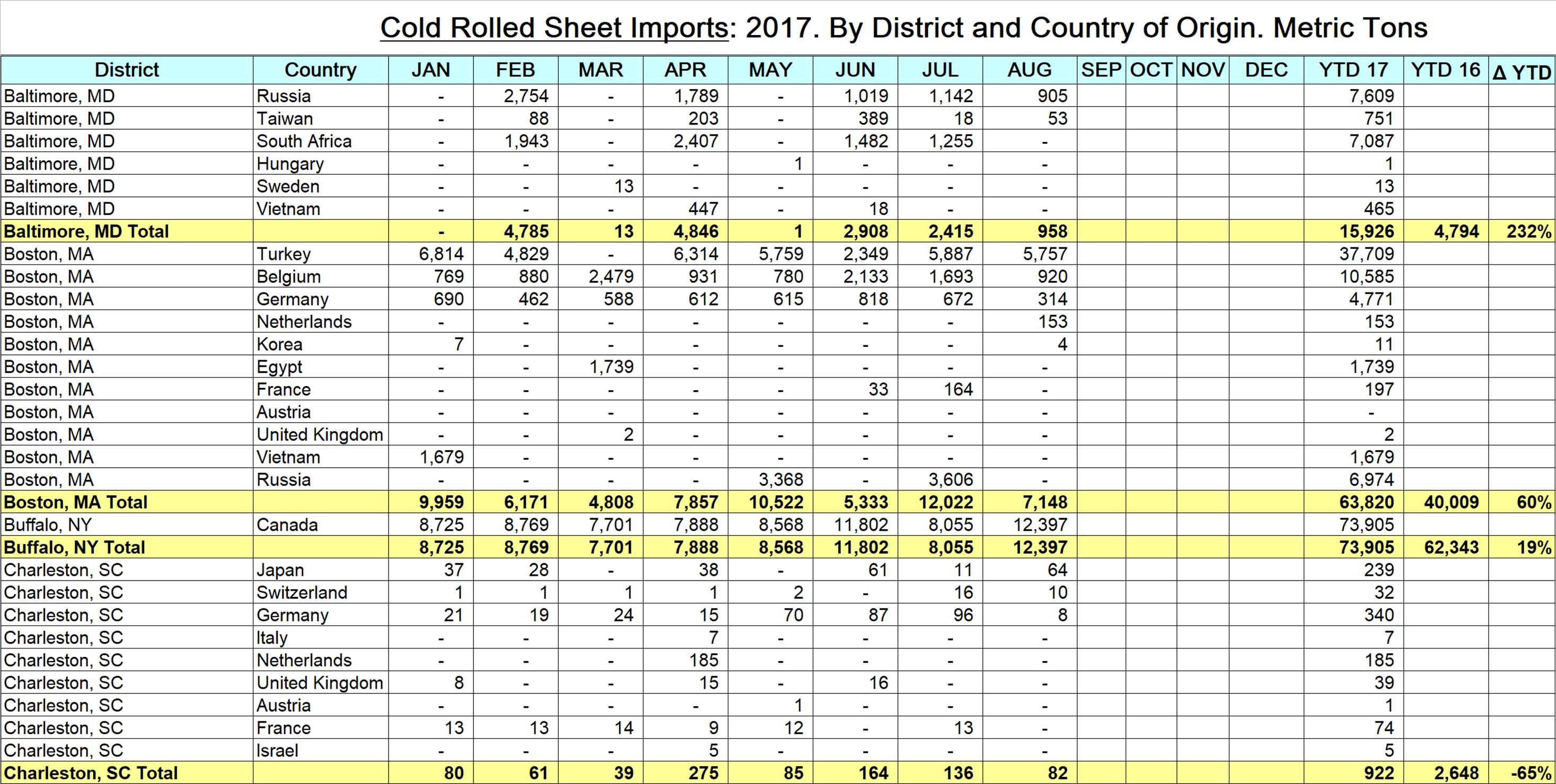 This Steel Market Update analysis of sheet and plate imports by district of entry and source through August 2017 includes both coiled and cut-to-length plate for the first time. We believe that misinformation (or a lack of) about regional import volumes is often used to influence purchase decisions. Our intent with this analysis of tonnage by district of entry is to describe in detail what is going on in a company’s immediate neighborhood and thus provide a negotiating advantage for our premium subscribers.