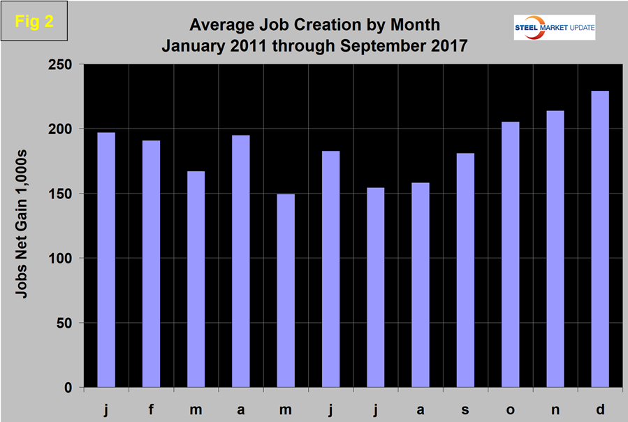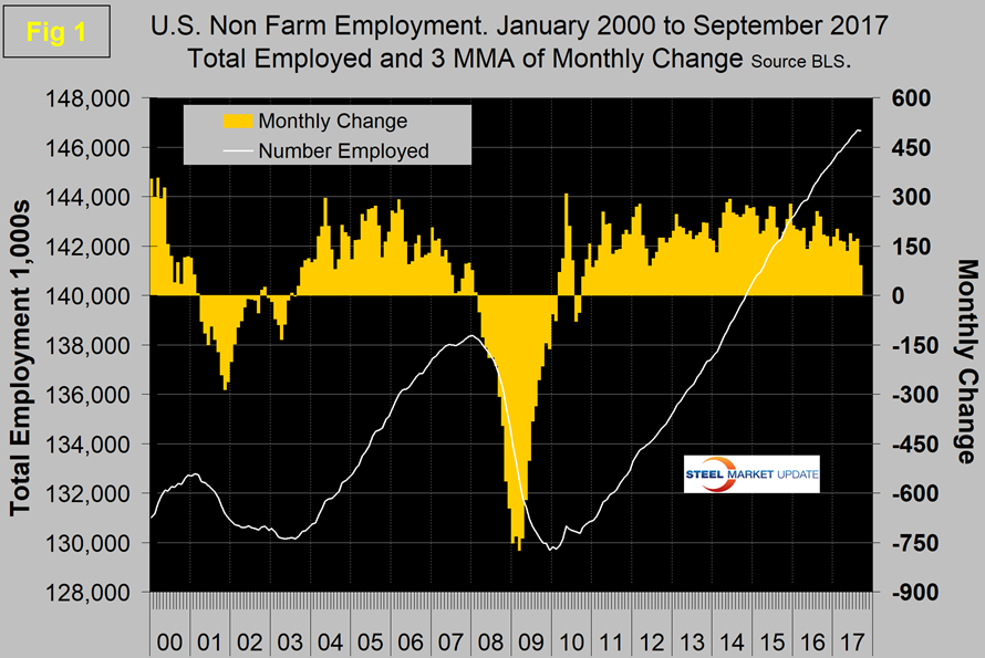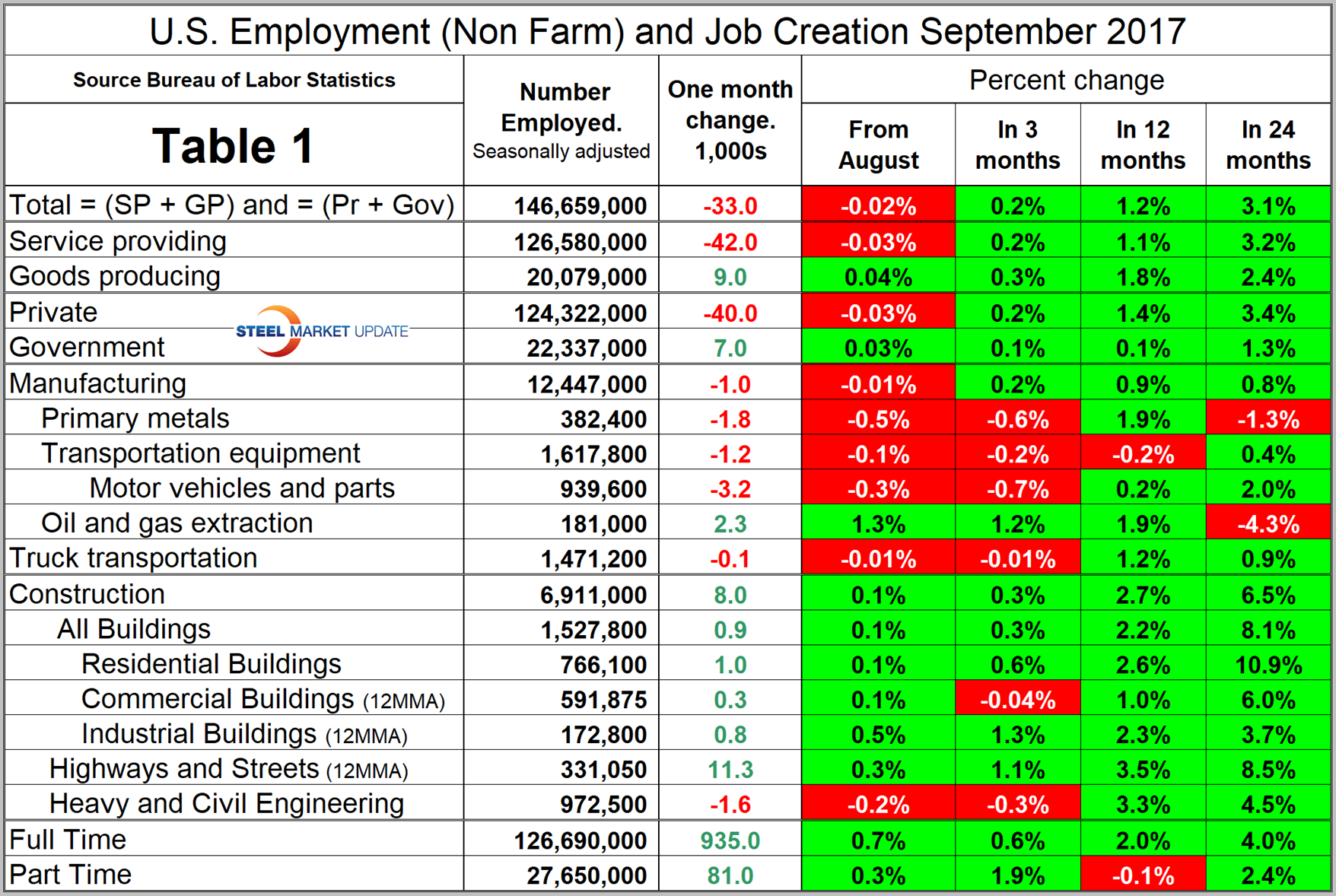 In September, manufacturing lost 1,000 positions but July was revised from a 26,000 gain to an 11,000 loss. All the revision was in motor vehicles and parts; therefore the summer re-tooling shutdowns must have been more extreme than the BLS realized. Manufacturing employment has increased by 0.2 percent in three months and by 0.9 percent in 12 months. Table 1 shows that primary metals have done better than manufacturing in the last 12 months, but have lost ground in the last three months. Within the big picture of manufacturing, oil and gas extraction was the only bright spot with gains of 1.2 percent in three months and 1.9 percent in 12 months. Truck transportation has lost ground in the last three months, but not by much. Note the subcomponents of both manufacturing and construction shown in Table 1 don’t add up to the total because we have only included those that are most relevant to the steel industry.