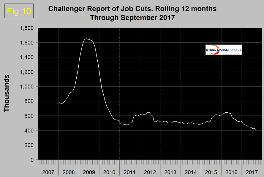 The last piece of the employment puzzle that we examine is the Challenger report, which measures job cuts monthly (Figure 10). This data also tends to be quite erratic; therefore, we again examine a rolling 12-month average and can see that job cuts decreased for most of 2016 and continued their downward trend in 2017. The result for September was the lowest since our data stream began at the end of 2007.