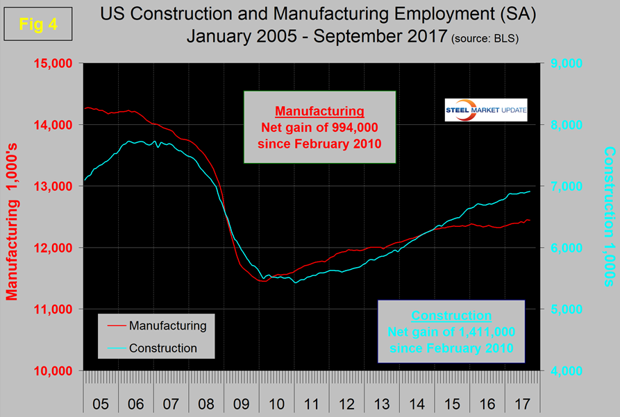 In September, 40,000 jobs were lost in the private sector and government gained 7,000. Not relevant to steel but of interest from the taxpayers’ point of view, employment by the federal government was unchanged after three losing months, state governments gained 2,000 jobs and local governments gained 5,000 jobs. Since February 2010, the employment low point, private employers have added 17,065,000 jobs as government has shed 139,000 as shown in Figure 3. (The spike in government employees in May 2010 was the temporary employment of census workers).