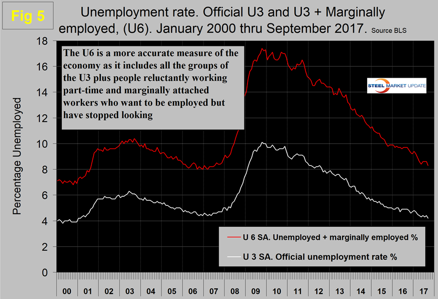 The official unemployment rate, U3, reported in the BLS household survey (see explanation below) came in at 4.2 percent in September, which was down from 4.4 percent in August and down from 4.9 percent in September last year. This number doesn’t consider those who have stopped looking. The more comprehensive U6 unemployment rate was down from 9.7 percent in September 2016 to 8.3 percent in September 2017 (Figure 5).