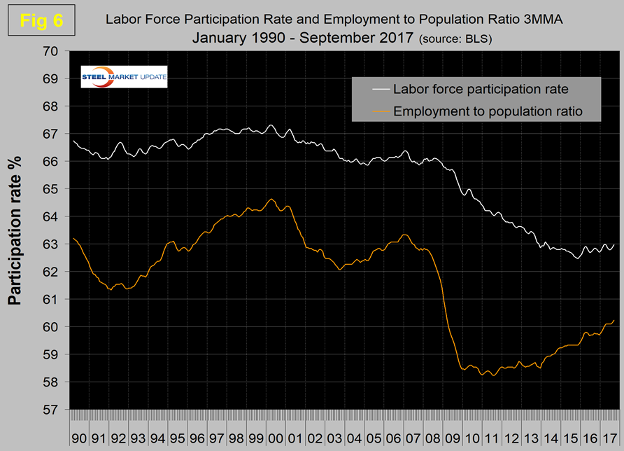 U6 includes workers working part-time who desire full-time work and people who want to work but are so discouraged that they have stopped looking. The differential between these rates was usually less than 4 percent before the recession, but is still 4.1 percent. The employment participation rate at 63.1 percent in September hasn’t changed much in the last 12 months. The Labor Force Participation Rate is a simple computation: You take the Civilian Labor Force (people age 16 and over who are employed or seeking employment) and divide it by the civilian non-institutional population (those 16 and over not in the military or committed to an institution). The result is the participation rate expressed as a percent. Another measure is the number employed as a percentage of the population, which seems to us to be more definitive. In September, this measure was 60.4 percent up from 59.7 percent in September last year and from 59.3 percent in September 2015. Figure 6 shows both the participation rate and the employment to population ratio on the same graph. It has been estimated that the economy needs to create about 150,000 jobs per month to keep up with population growth. In the last 12 months, the average monthly job creation has been 148,000 per month. Therefore, since the ratio to population has improved, it looks as though the 150,000 number is too high.