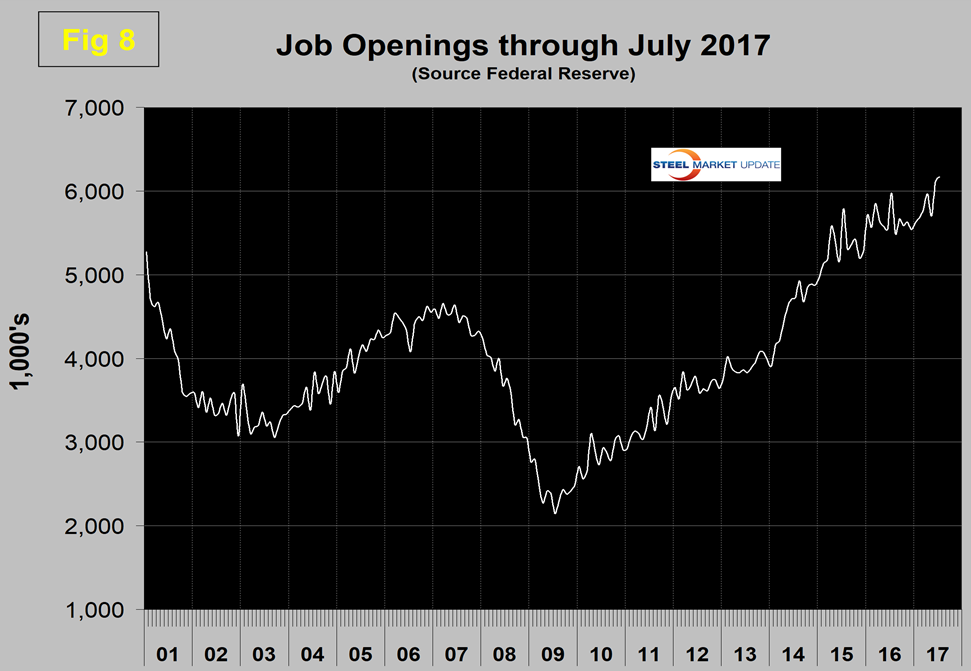 The job openings report known as JOLTS is reported on about the 10th of the month by the Federal Reserve and is over a month in arrears. Figure 8 shows the history of unfilled job openings through July when openings stood at 6,170,000— an all-time high. There has been an improving trend since mid-2009.