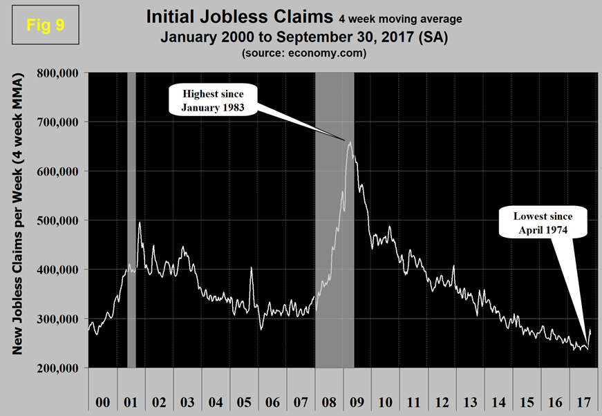 Initial claims for unemployment insurance, reported weekly by the Department of Labor, increased dramatically in September. We always report a four-week moving average of this data to smooth out short-term variations, but even so there have been four consecutive increases in the data to the highest level since February 2016. Economy.com had this to say on Thursday: “The high levels of initial claims are a testament to the havoc hurricanes Harvey and Irma wreaked. However, new filings are declining in Texas and Florida as the impacts on the labor markets fade. Advanced not seasonally adjusted new filings fell 3,040 in Texas and 3,765 in Florida in the week ended Sept. 30. Turning to Puerto Rico, which was hit by Hurricane Maria, advanced not seasonally adjusted new filings fell 174 in the week ended Sept. 30. However, the decline in Puerto Rico is because the hurricane is preventing claims from being filed and processed. As this backlog is worked off in subsequent weeks, initial claims in Puerto Rico are sure to rise. This is still the longest streak since 1973 of initial claims below 300,000 (Figure 9).”
