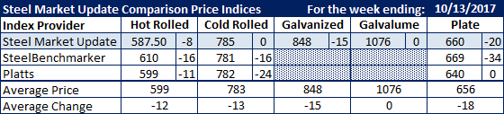 Plate prices dropped on SMU index and SteelBenchmarker, while Platts has remained the same. However, when comparing the numbers, you need to realize that the SMU $660 per ton average is a delivered price and not FOB a mill like Platts and SteelBenchmarker.