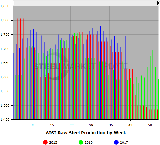 Below is a graph showing the history of weekly raw steel production. You will need to view the graph on our website to use its interactive features, you can do so by clicking here. If you need assistance logging into or navigating the website, please contact our office at 800-432-3475 or info@SteelMarketUpdate.com.