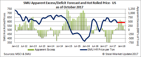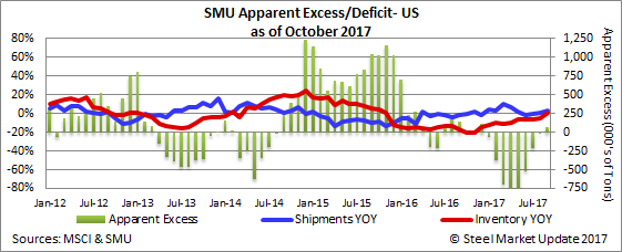 Our forecast called for distributors to remain relatively balanced moving out of a small deficit to a small excess. Our forecast called for a change from -26,000 tons at the end of August to +37,000 tons at the end of September. The actual “excess” grew to +68,000 tons, which we consider to be a balanced situation for the flat rolled distributors.