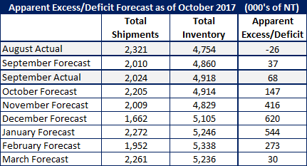 Our forecast called for distributors to remain relatively balanced moving out of a small deficit to a small excess. Our forecast called for a change from -26,000 tons at the end of August to +37,000 tons at the end of September. The actual “excess” grew to +68,000 tons, which we consider to be a balanced situation for the flat rolled distributors.