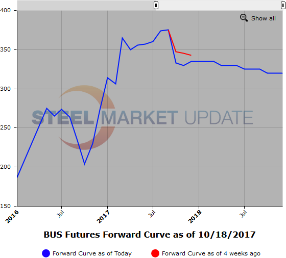 In U.S. domestic scrap markets, the chatter has BUS rebounding $20 to $30/GT for Nov’17 period. Have seen BUS bids rise with the move higher in HR. Offers remain well above the current spot market. With lower anticipated imports going into year-end, it seems we could get a nice pickup in demand for BUS.