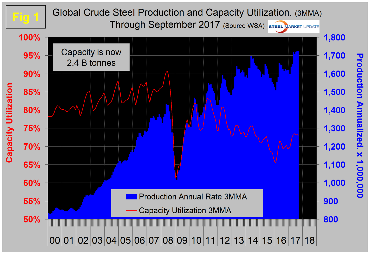 Figure 1 shows monthly production and capacity utilization since January 2000. The summer slowdown that has occurred in each of the last seven years is not happening in 2017. On a tons-per-day basis, production in September was 4.714 million metric tons with a 3MMA of 4.684 million metric tons, which was down slightly from the all-time high in April of 4.741 million metric tons.