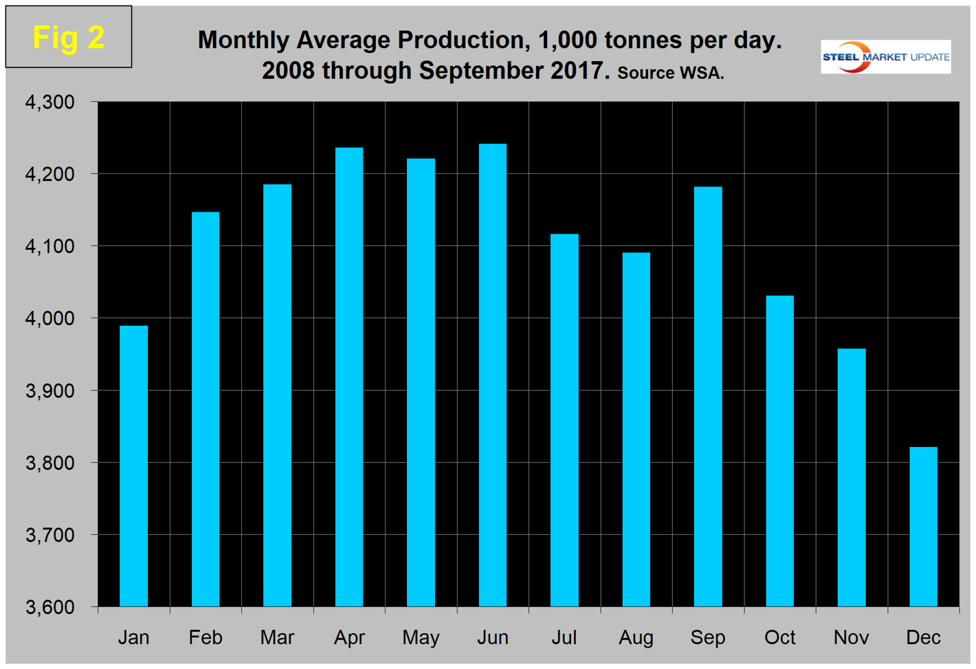 As we dig deeper, we start with seasonality. Global production has peaked in the early summer for the last seven years with April and June averaging the highest volume. Figure 2 shows the average metric tons per day production for each month since 2008.