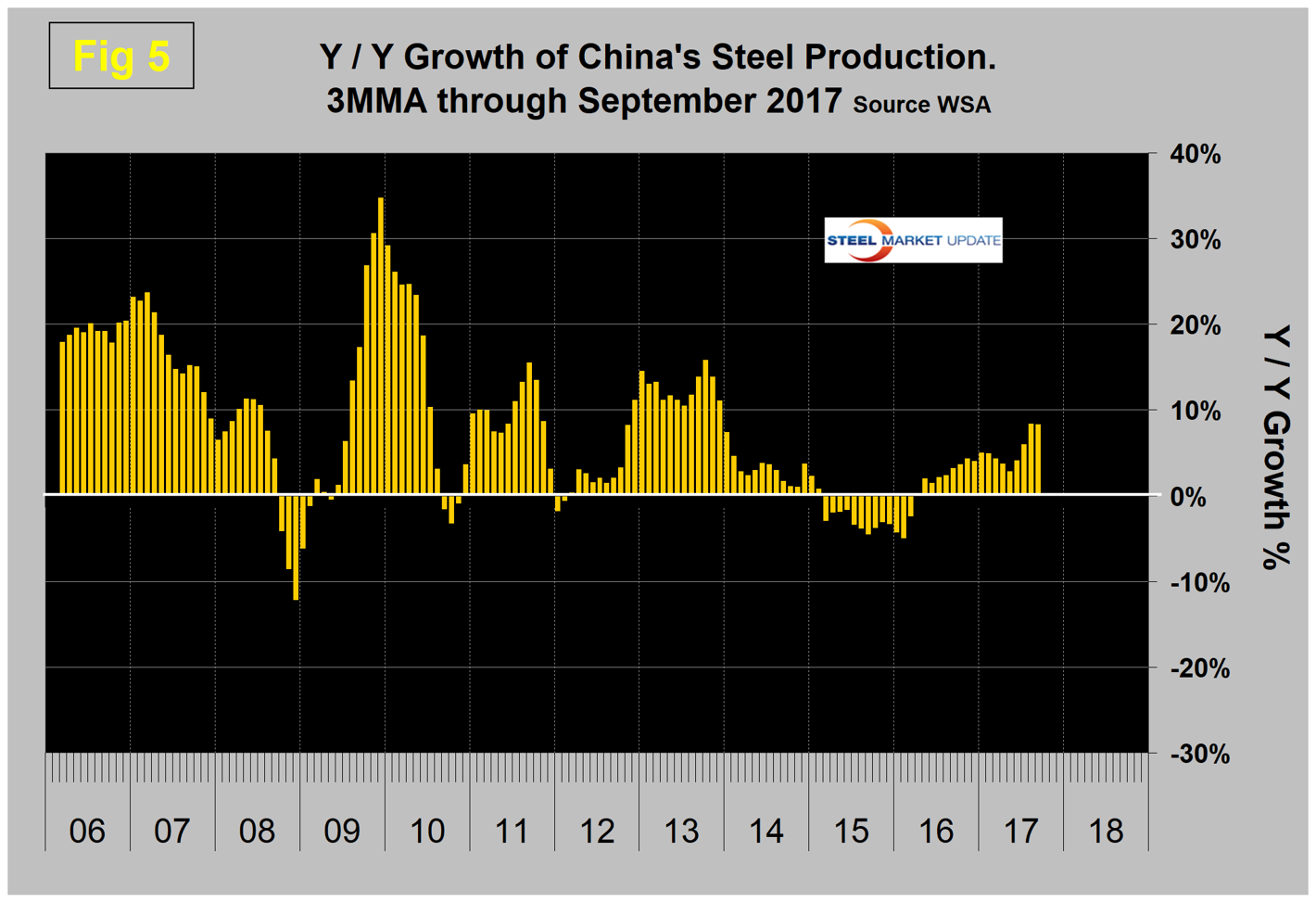 Figure 4 shows China’s production since 2005 and Figure 5 shows the year-over-year growth. China’s production after slowing for 13 straight months year over year returned to positive growth each month in May 2016 through September this year.