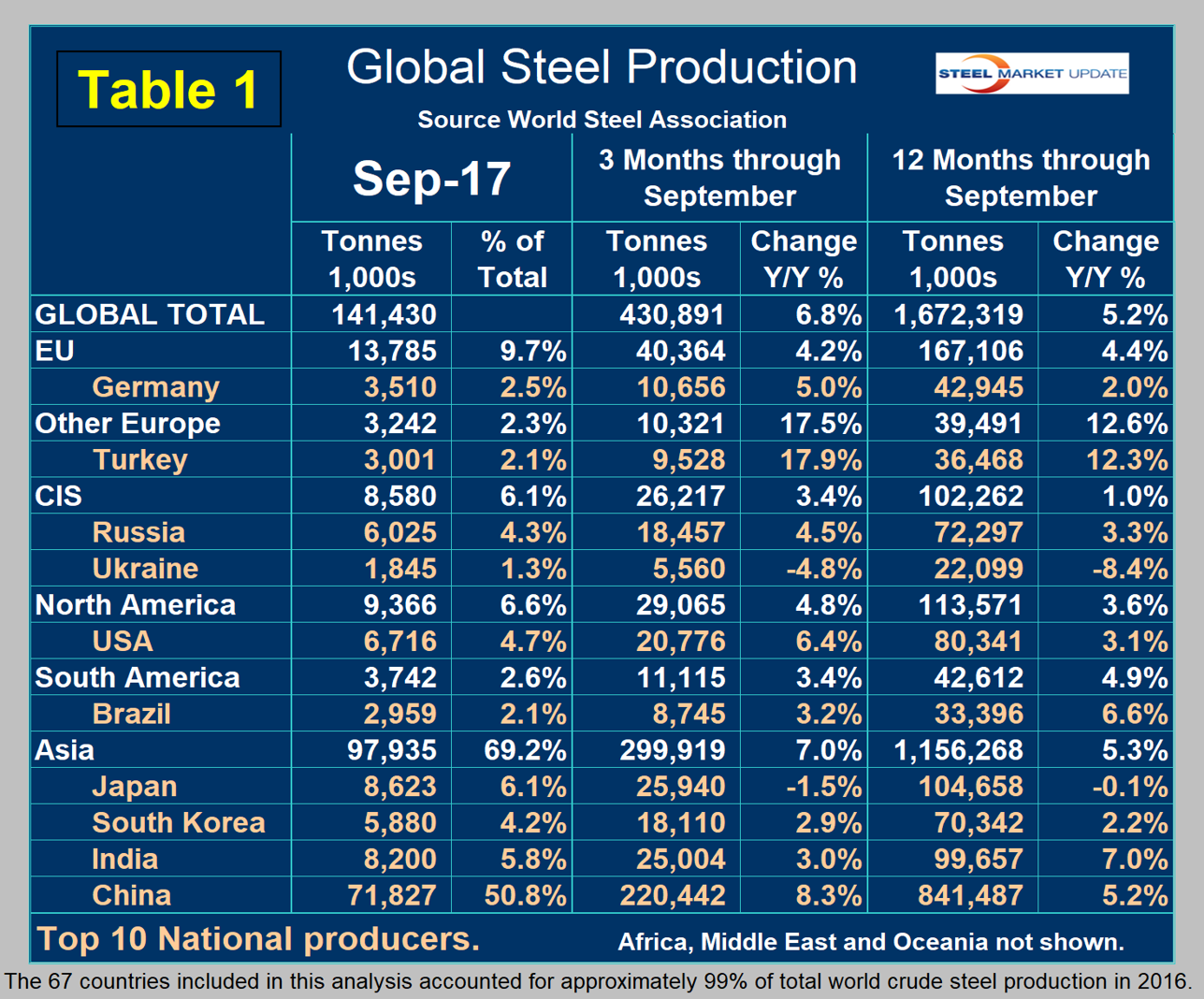 Table 1 shows global production broken down into regions, the production of the top 10 nations in the single month of September, and their share of the global total. It also shows the latest three months’ and 12 months’ production through September with year-over-year growth rates for each period. Regions are shown in white font and individual nations in beige.