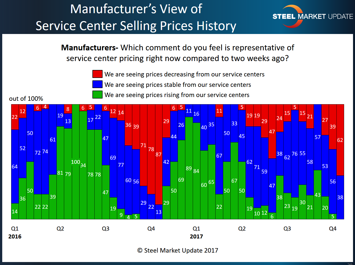 The 62 percent of manufacturers and 48 percent of service centers are the highest percentages seen in response to this question since Q4 2016 when we saw the market reach capitulation.