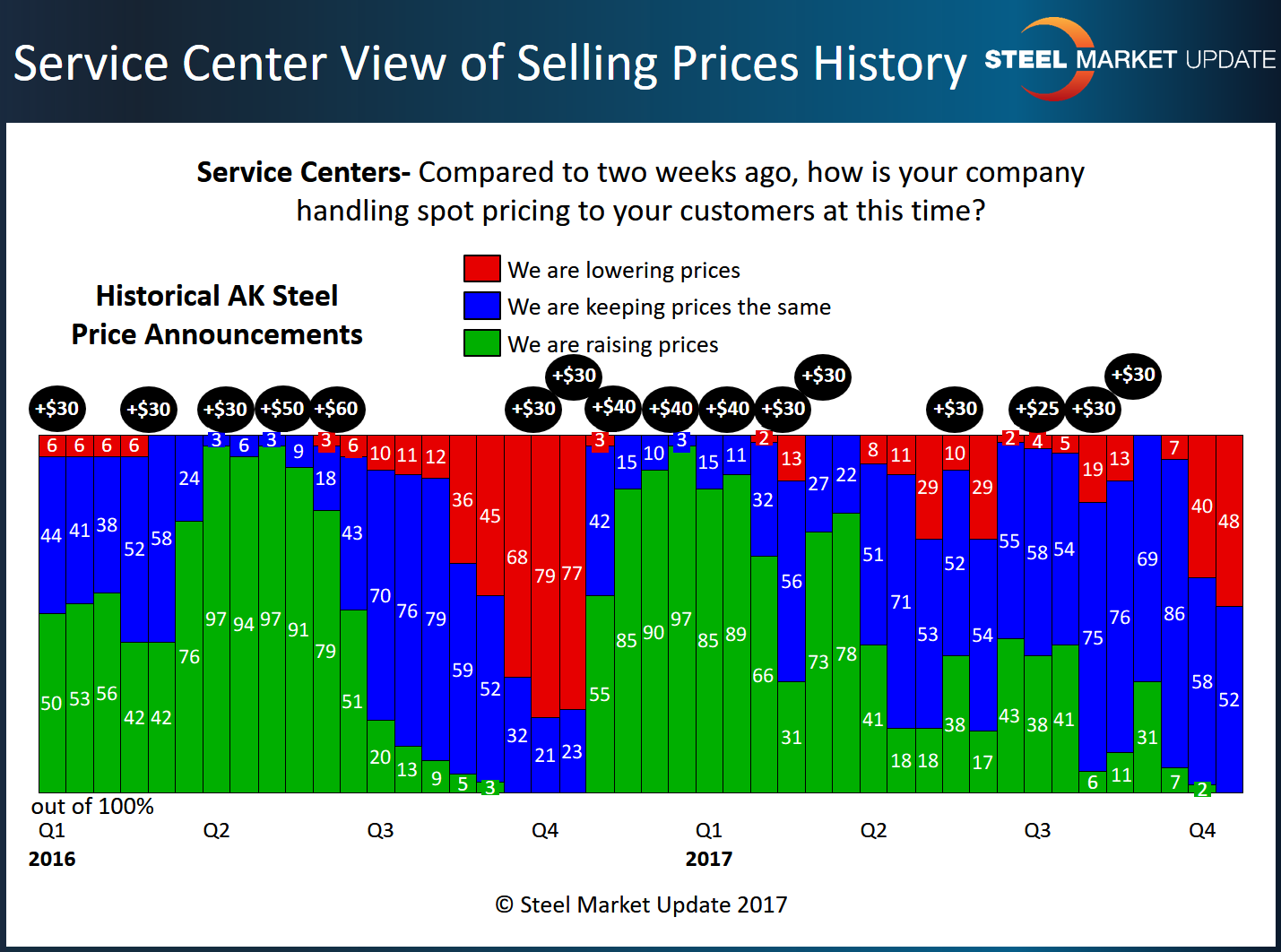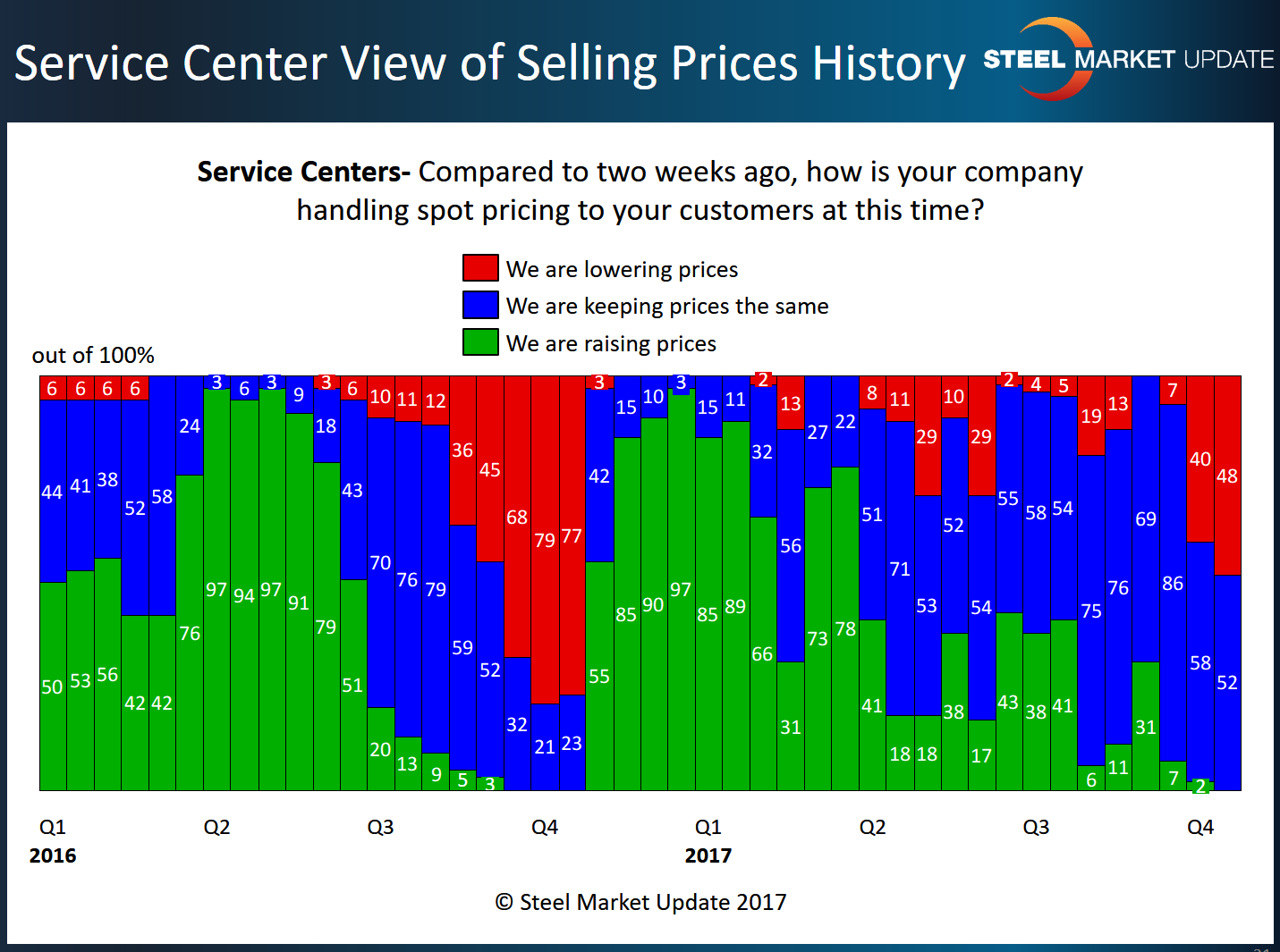 This becomes important when price increase announcements are made. When there is strong support for the newly announced steel mill price increases, service centers will change their spot prices immediately, and this is caught in our analysis of the industry. You can clearly see this in the graphic below when looking at Fourth Quarter 2016. Almost 80 percent of service centers were admitting to dropping prices, and by mid-November 85 percent reported their company as raising prices.