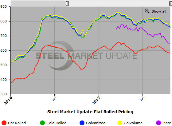SMU Note: Below is a graphic showing our hot rolled, cold rolled, galvanized, Galvalume, and plate price history. To use the graph’s interactive capabilities, you must view it on our website here. If you need help navigating the website or need to know your login information, contact us at info@SteelMarketUpdate.com or 800-432-3475.