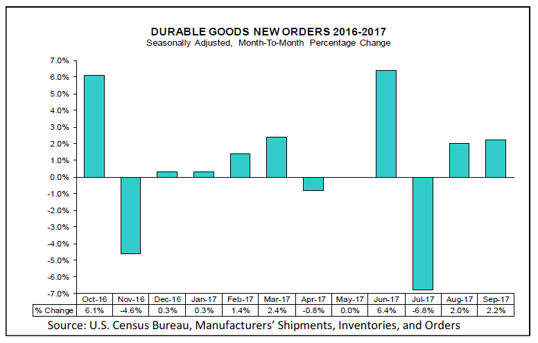 Nondefense new orders for capital goods in September increased $4.3 billion or 6.1 percent to $74.9 billion. Shipments increased $1.7 billion or 2.4 percent to $73.5 billion. Unfilled orders increased $1.3 billion or 0.2 percent to $704.8 billion. Inventories increased $1.4 billion or 0.8 percent to $179.9 billion. Defense new orders for capital goods in September increased $0.5 billion or 4.1 percent to $11.5 billion. Shipments increased $0.2 billion or 1.7 percent to $10.6 billion. Unfilled orders increased $0.9 billion or 0.7 percent to $143.9 billion. Inventories decreased $0.1 billion or 0.3 percent to $23.4 billion.