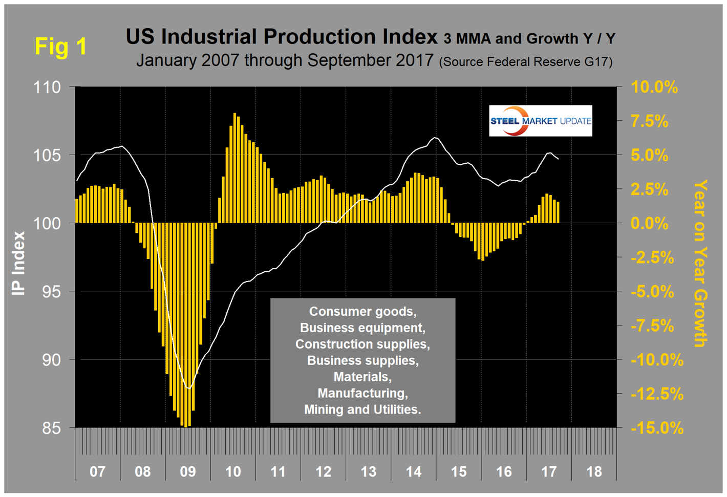 The Industrial Production Index: Figure 1 shows the IP index since January 2007 with the year-over-year growth. The three-month moving average (3MMA) had negative growth every month from October 2015 through December 2016 as shown by the brown bars in Figure 1. January this year was the first month of positive growth in the 3MMA since August 2015. Growth improved in each of the 10 months through June 2017 from negative 1.24 percent in September last year to positive 2.12 percent in June, before falling back to 1.53 percent in September. KeyBanc Capital Markets reported:Industrial Production in September 2017 grew 1.6 percent year over year. The sequentially stronger September reading was primarily driven by a +1.3 percent year-over-year gain in Mining in Other Durables (+0.5 percent), Machinery (+0.4 percent) and Nondurables (+0.2 percent). These gains were offset by year-over-year declines in Utilities (-0.5 percent) and Automotive (-0.2 percent), the latter of which has declined for three consecutive months. On a month-over-month basis, we note the continued effects of Hurricane Harvey, and to a lesser degree of Hurricane Irma, combined to hold down the growth in total production in September by 0.25 percent. The Federal Reserve notes that for the third quarter as a whole, IP fell 1.5 percent at an annual rate, though excluding the effects of the hurricanes, the index would have risen at least 0.5 percent.