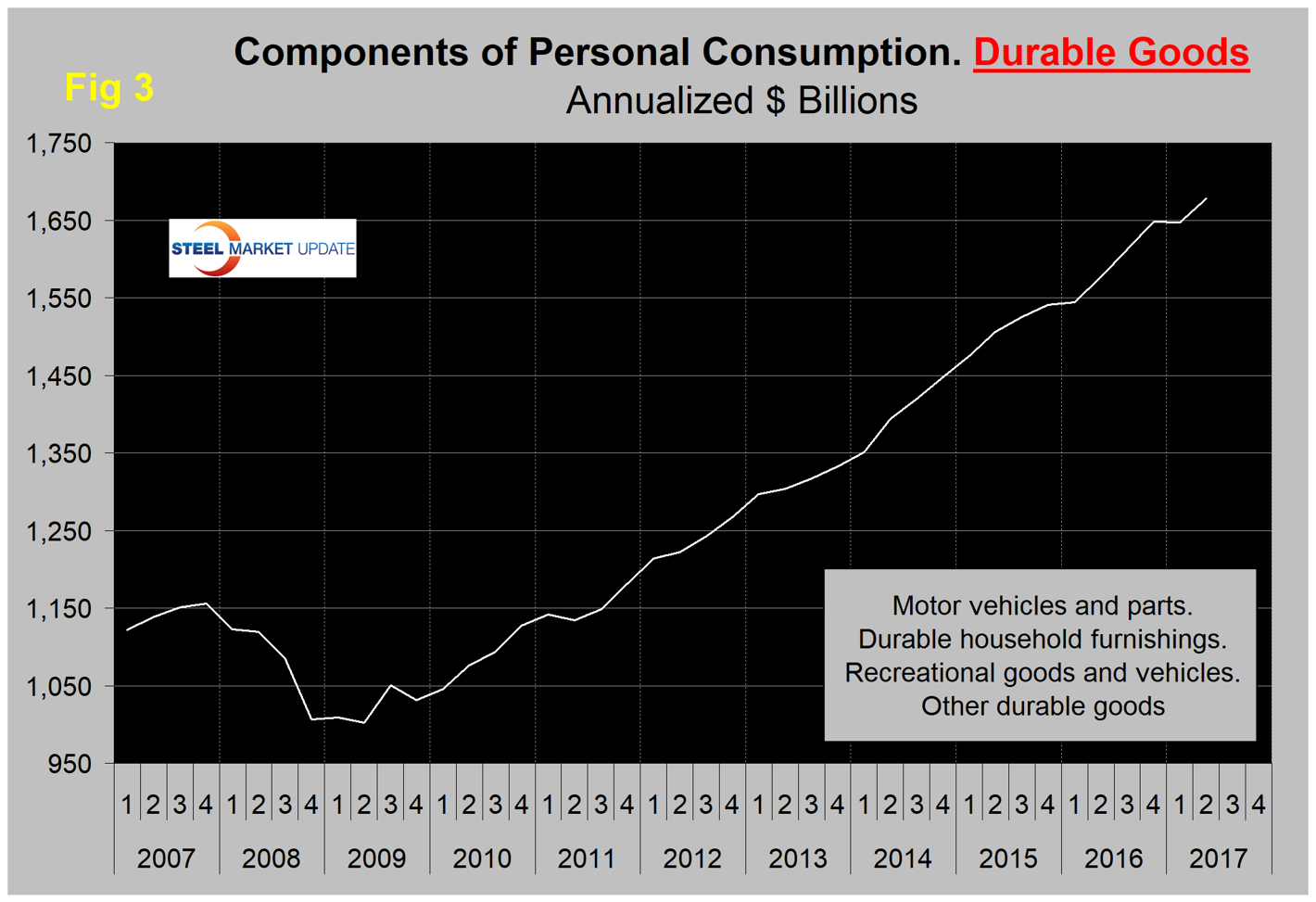 The Durable Goods Portion of GDP: The third estimate of Q2 GDP confirmed the second estimate of a 3.1 percent growth rate. A sub-component of the quarterly data is durable goods, which is part of the personal consumption calculation. It therefore contains no military hardware or civil aircraft data. This is shown in Figure 3 and, presumably because of the exclusions just mentioned, looks nothing like Figure 2. With the exception of one quarter, which was Q1 2017, the durable goods portion of GDP saw positive growth every quarter since Q2 2011.