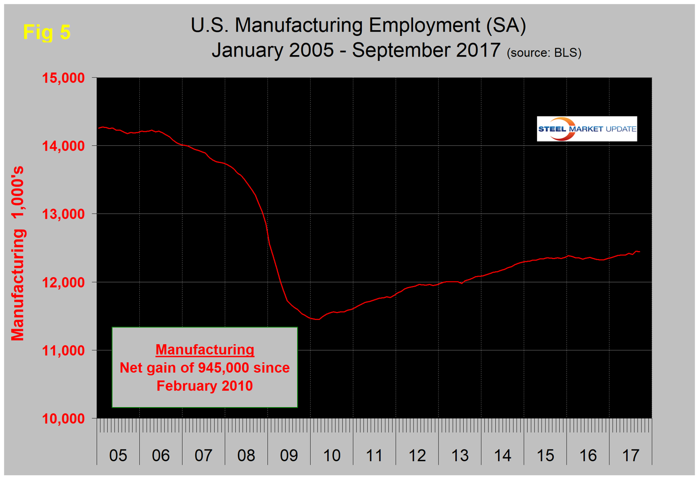 SMU Comment: The ISM index, which we give the most credence, is at its strongest level since April 2011 and signaling expansion. This is the only leading indicator examined in this update. Auto assemblies and supplier industries are slowing in NAFTA and the U.S. and Canada are losing share to Mexico. Manufacturing has added 104,000 jobs this year through September and the employment component of the ISM index has had positive growth in each of the last 12 months. The industrial production index and new orders for durable goods have positive growth. Therefore, we conclude that the balance of these seven measures are positive and portend well for the remainder of 2017.