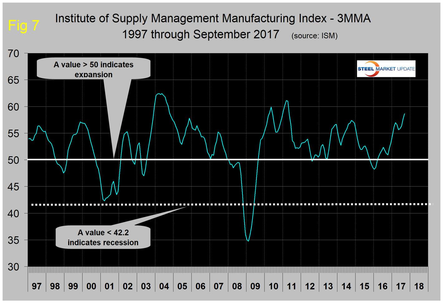 The ISM Manufacturing Index: The Institute for Supply Management’s manufacturing index is a diffusion index. ISM states: “Diffusion indexes have the properties of leading indicators and are convenient summary measures showing the prevailing direction of change and the scope of change. An index value above 50 percent indicates that the manufacturing economy is generally expanding; below 50 percent indicates the opposite.” Figure 7 shows the 3MMA of the ISM index from January 1997 through September 2017 with an improving trend since January 2016. In September, the 3MMA of the index at 58.63 was the highest since April 2011.