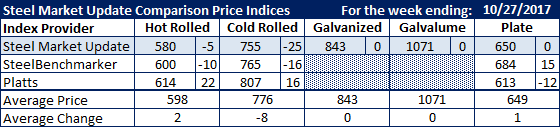 We saw a similar change in cold rolled with Platts taking their numbers up $16 per ton to $806.50 (we rounded to $807 per ton), with SMU down $25 to $755 per ton and SteelBenchmarker down $16 to $765 per ton.