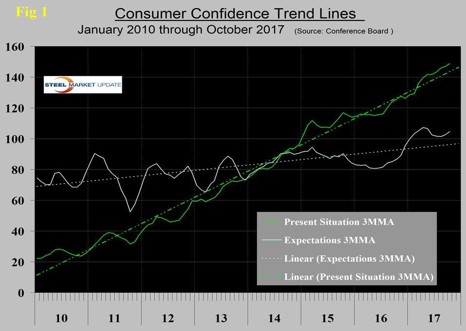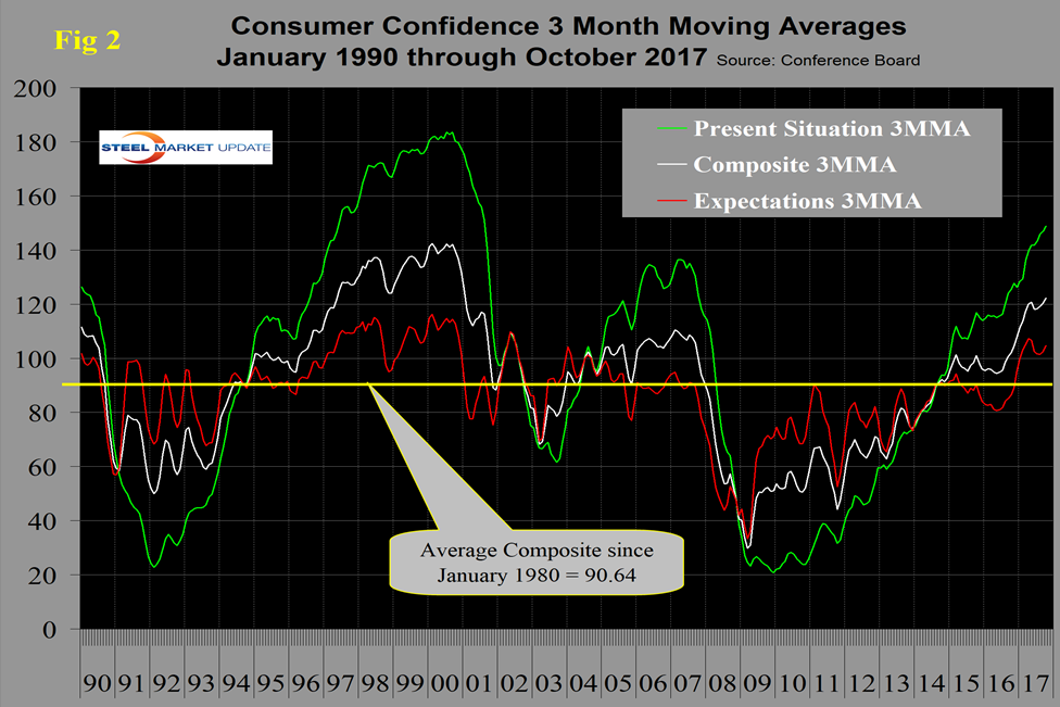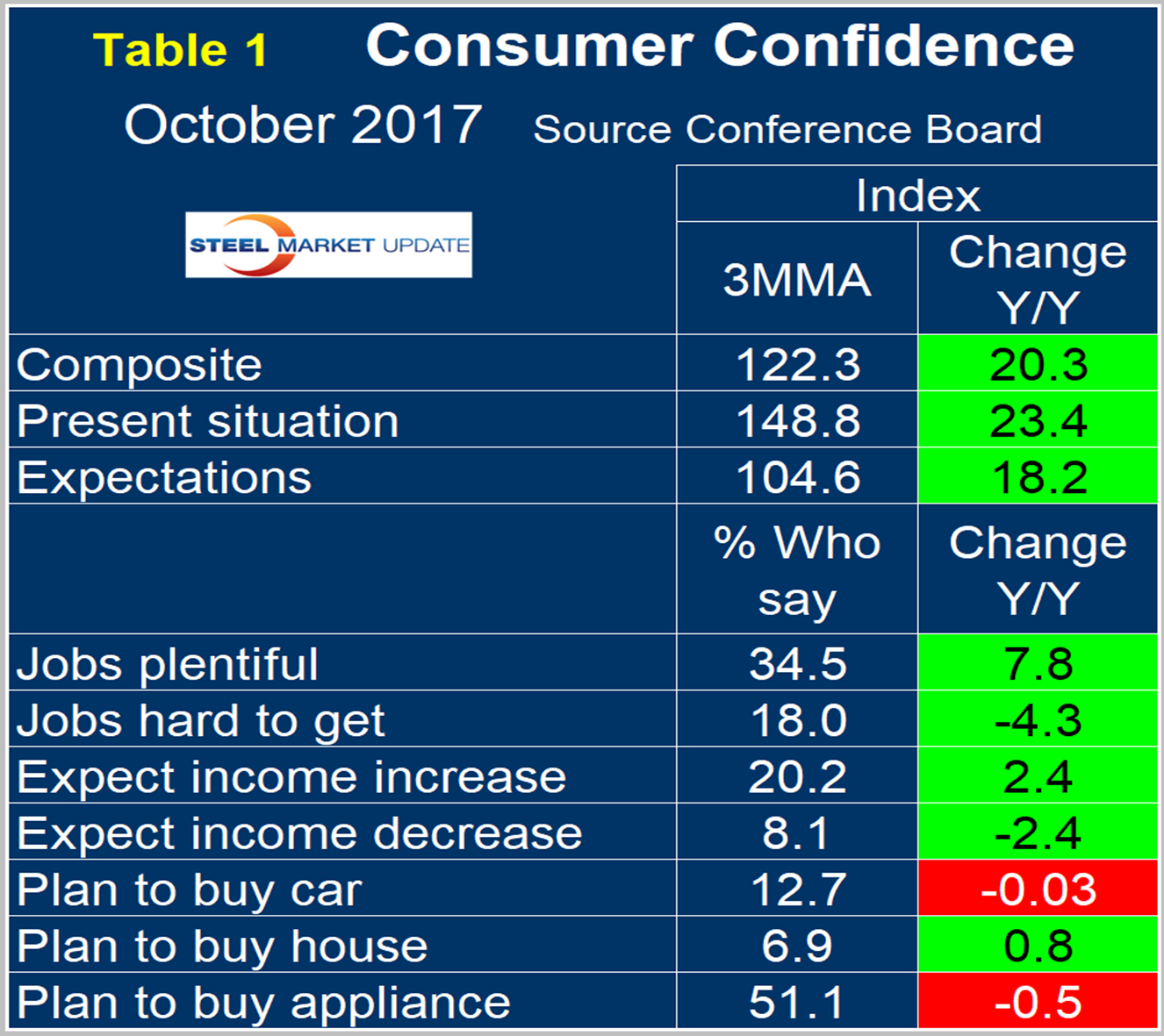 Consumers’ view of the current economy surged in October, reports The Conference Board. Its composite value of consumer confidence in October was 125.9, up from 120.6 in September. The last eight months have each been better than at any time since 2001. The three-month moving average (3MMA) increased from 120.3 in September to 122.3 in October, which was 20.3 points higher than in October last year. Consumer confidence is the driver of consumer spending, which is the largest component of GDP and ultimately drives a large portion of steel consumption.
