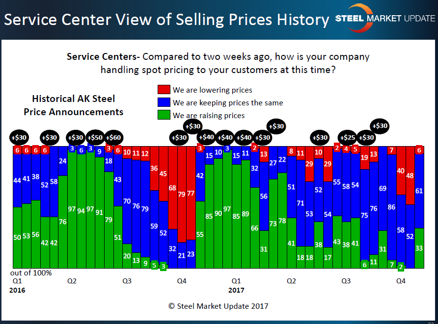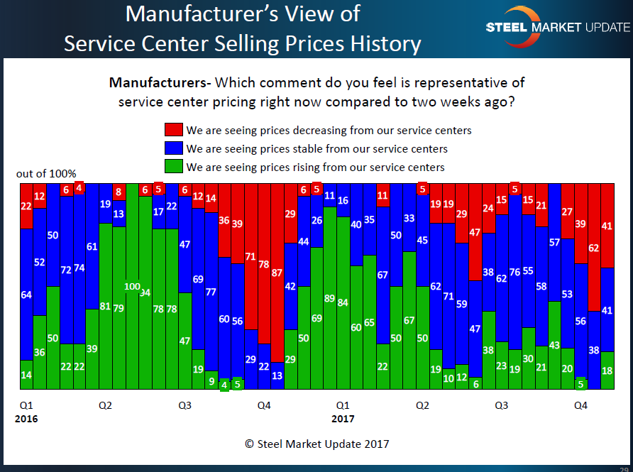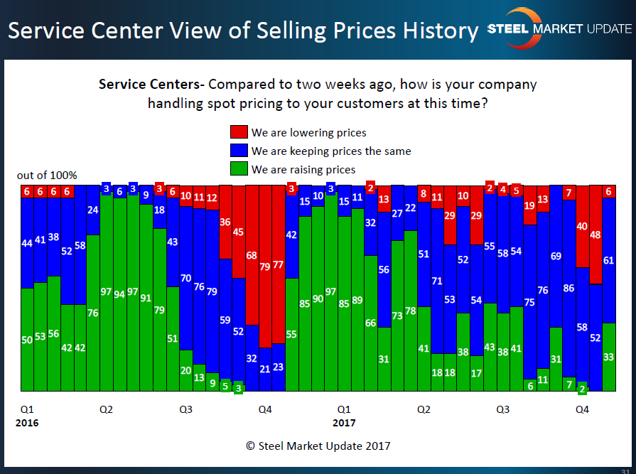 The direction change collected last week is much more pronounced than what the manufacturers reported, with 33 percent of the service center respondents reporting their company as asking for higher spot prices and only 6 percent reported their company as lowering prices.