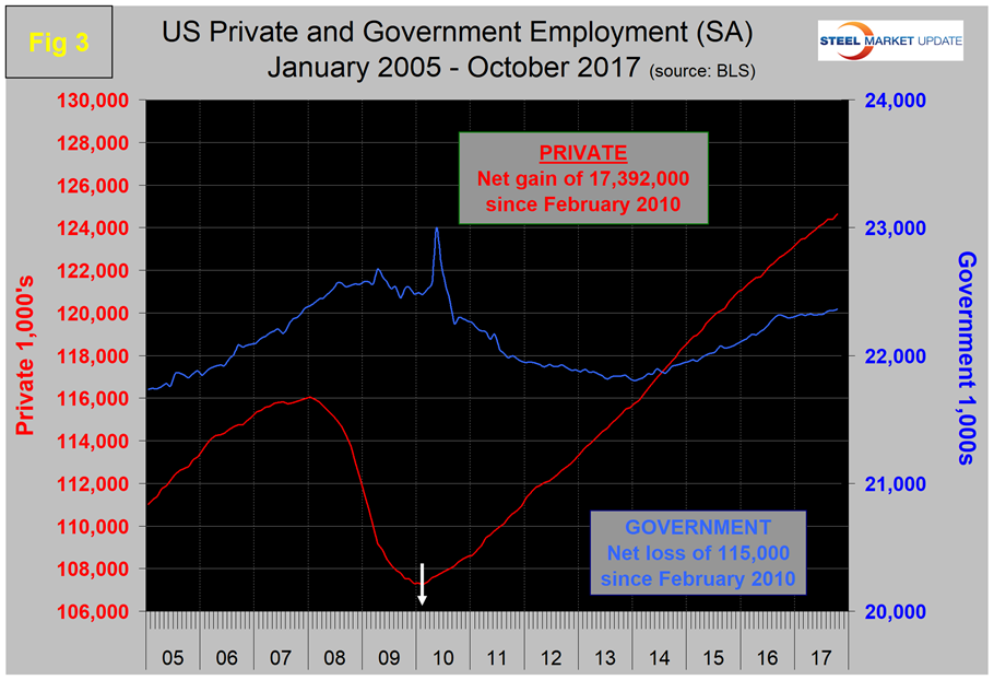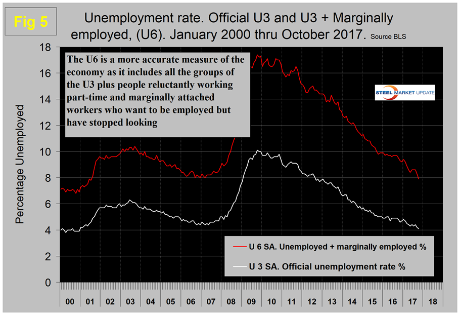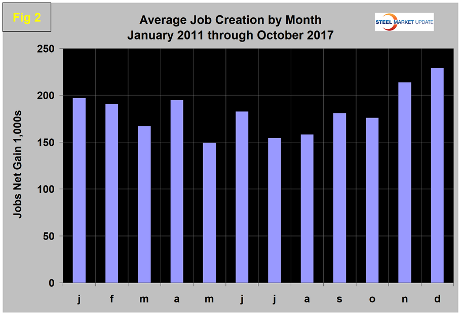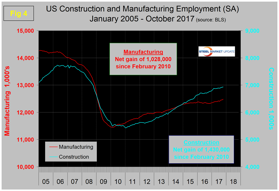 SMU Comment: Job openings are close to an all-time high, new claims for unemployment are at a 44-year low, employers are hanging onto their people, manufacturing employment is 1.3 percent higher than this time last year and construction is up 2.8 percent. The employment situation has been described as “full” by some analysts. October was the 84th consecutive month of job growth, but Figure 1 shows a slowing trend since the middle of 2014. If as reported there is a shortage of qualified employees, we can expect an increase in wage-driven inflation in the near future. The results for manufacturing and construction are sign posts for steel sales activity. 2017 is heading strongly for the finish line.