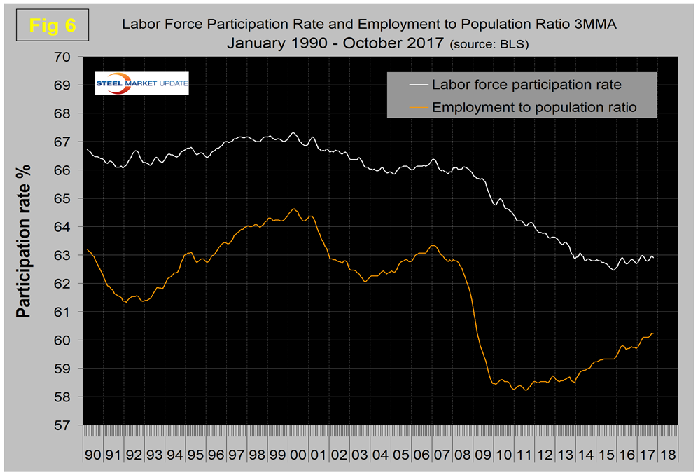 The employment participation rate at 62.7 percent in October was down slightly from 62.8 percent in October last year. We’re not sure what this is a percentage “of” because of the multiple descriptions of the labor pool. Another measure is the number employed as a percentage of the population, which we think is much more definitive. In October, this measure was 60.2 percent, up from 59.7 percent in October last year and from 59.3 percent in October 2015. The employment-to-population ratio stalled for most of last year, but has made progress in 2017. Figure 6 shows both measures on one graph.
