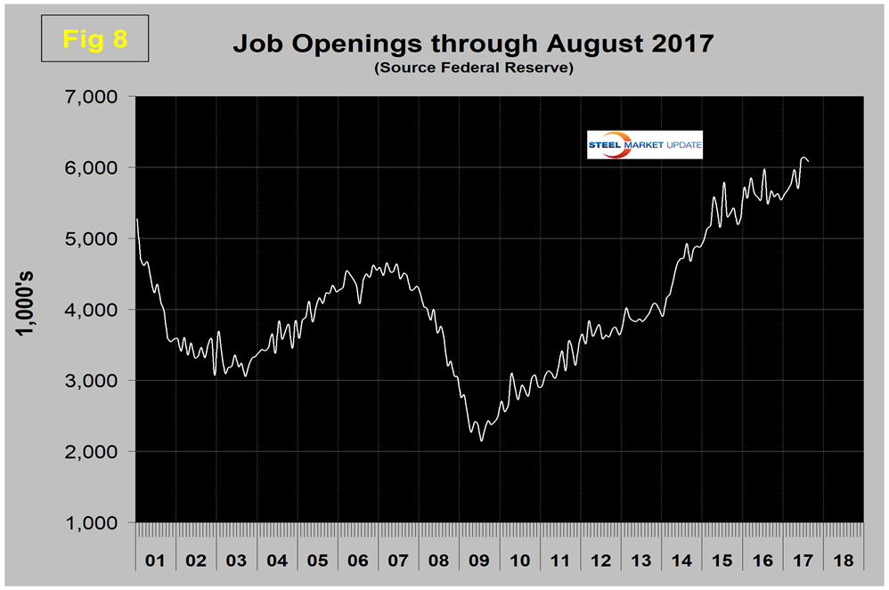 The job openings report known as JOLTS is reported on about the 10th of the month by the Federal Reserve and is over a month in arrears. Figure 8 shows the history of unfilled job openings through August when openings stood at 6,082,000, not far off the all-time high of 6,116,000 in June this year. There has been an improving trend since mid-2009.