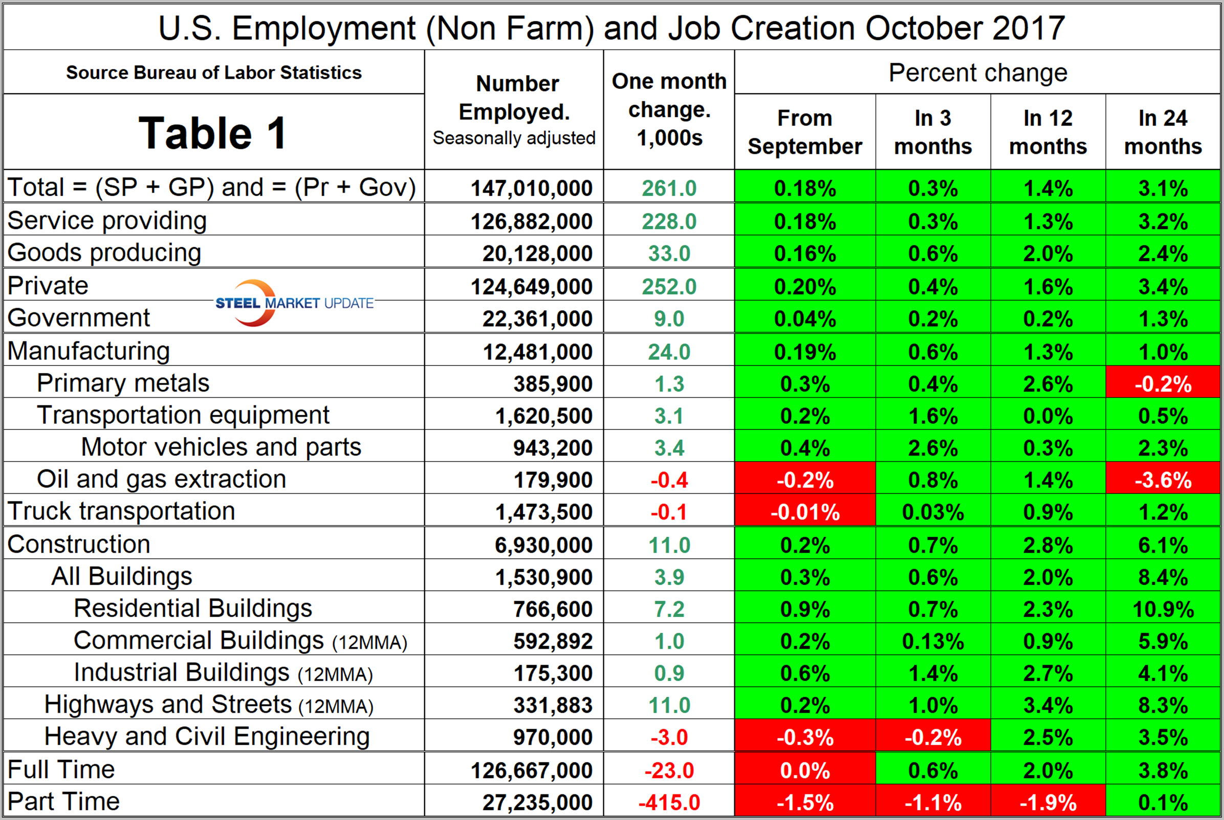 In October, manufacturing gained 24,000 positions; manufacturing has had only one losing month since October last year. In the first 10 months of 2017, manufacturing has gained 138,000 jobs and is 1.3 percent higher than the same month in 2016. Table 1 shows that primary metals gained 1,300 jobs in October, and is up by 10,100 year to date. Motor vehicles and parts industries gained 3,400 jobs in October. Trucking had strong growth in both February and March, but in the first 10 months of 2017 has had six losing months. Oil and gas extraction has been stalled since August last year with only a 2,000-job net gain in that time frame. Note that the subcomponents of both manufacturing and construction shown in Table 1 don’t add up to the total because we have only included those we think have most relevance to the steel industry.