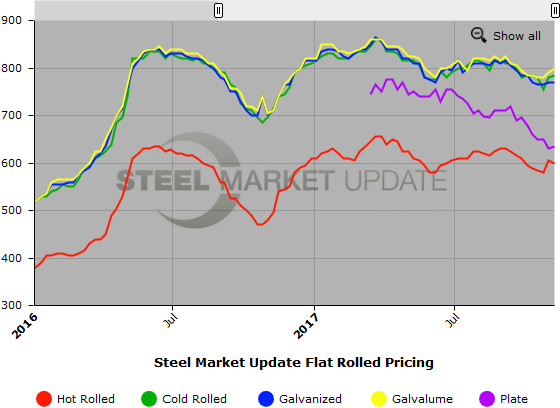 SMU Note: Below is a graphic showing our hot rolled, cold rolled, galvanized, Galvalume, and plate price history. To use the graph’s interactive capabilities, you must view it on our website here. If you need help navigating the website or need to know your login information, contact us at info@SteelMarketUpdate.com or 800-432-3475.