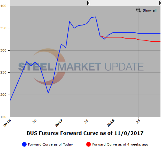 In the domestic prime scrap market, prices have eased some. BUS prices for November look to be sideways for Chicago and likely down $5-10/GT for the BUS ($333/GT Oct’17 to $323-328/GT Nov’17). Latest trade prices for Dec’17 were at $349/GT, however with the metal margin backing up slightly, buying interest has retraced to the $330/335/GT level. BUS sellers have held steady with recent offers.