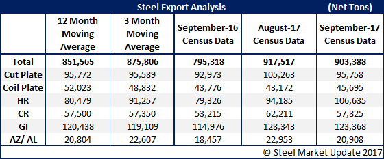 U.S. steel exports in September totaled 903,388 net tons (819,541 metric tons), down 1.5 percent over August, but up 13.6 percent from September 2016. Total exports have averaged around 885,000 tons over the last few months after reaching a 2.5-year high in May (1,006,087 tons). The total September export figure is above both the three-month moving average (average of July 2017, August 2017 and September 2017), and the 12-month moving average (average of October 2016 through September 2017). Here is a breakdown of flat rolled and plate steel exports:
