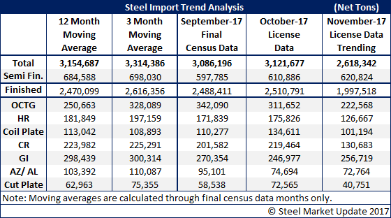 Finished steel imports are trending below 2.0 million tons, or more than 500,000 net tons less than the month of October.