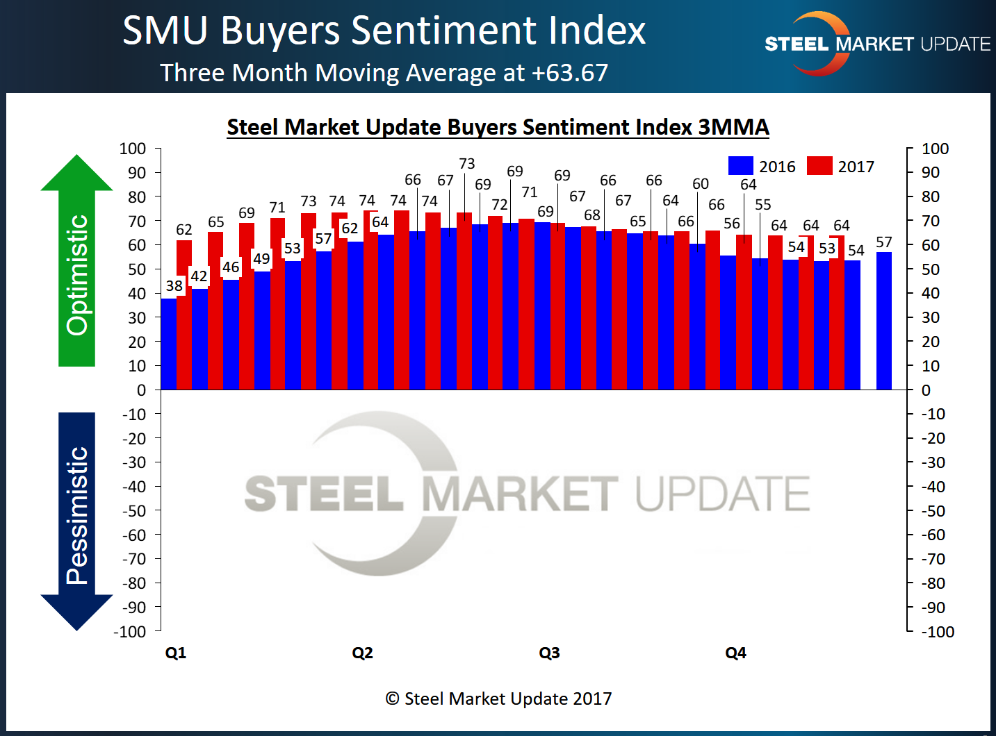 Despite all the uncertainty regarding possible trade action and steel prices, the Steel Market Update Steel Buyers Sentiment Index is holding steady, and at a higher level than last year. Steel buyers’ sentiment appears to have bottomed out in October and November and, in Steel Market Update’s opinion, is poised to pick up along with business in the coming first-quarter if the market follows the pattern of the past few years.