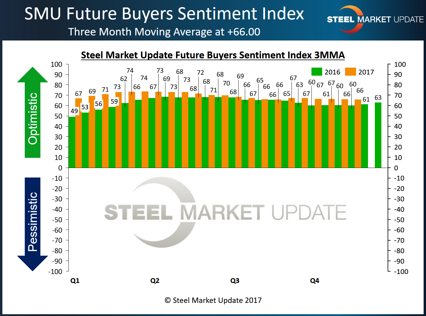 As a three-month moving average, Future Sentiment registered +66.00, down slightly from +66.50 a month ago. Last year in mid-November, the Futures Sentiment Index was a less-optimistic +60.17. Looking at the graphs for both current and future data, the bars illustrate that steel buyers have been more optimistic throughout 2017 vs. 2016, particularly later in the year.