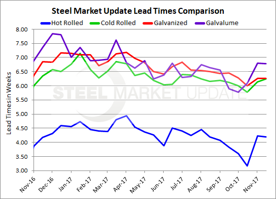 Hot rolled lead times averaged 4.20 weeks in mid-November, about the same as early in the month, but a week longer than in mid-October when HRC lead times averaged 3.16 weeks. Last year at this time, in a period when hot rolled prices were on the rise, HRC lead times were about the same at 4.18 weeks.