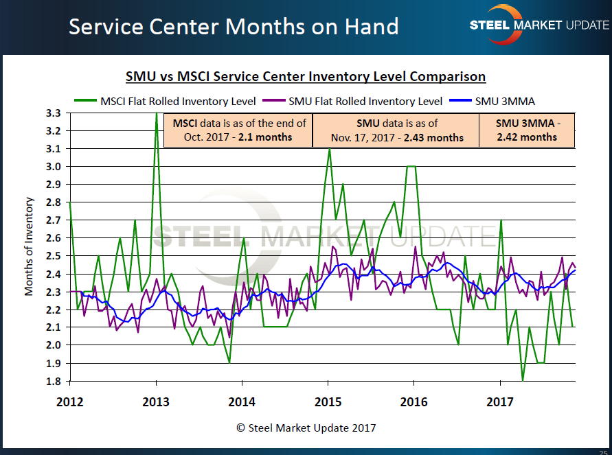 In last week’s survey, we found inventories to be averaging 2.43 months of supply. This is higher than MSCI, which reported service center inventories at 2.1 months of supply on carbon flat rolled as of the end of October.