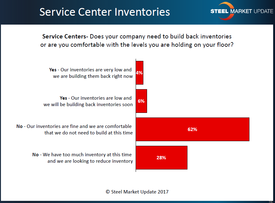 In the analysis just completed last Friday, 10 percent of the service center respondents reported inventory levels as low and being built back either right now (4 percent) or soon (6 percent). The rest of the respondents reported inventories as being “comfortable” (62 percent) or in excess of where their company would like them to be (28 percent).