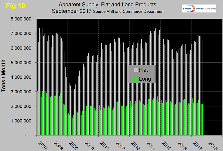 SMU Comment: In Figures 2, 3, 4, 5 and 6, the white lines show tons per day shipments on a 3MMA basis. In the first few months of 2017, there was the normal seasonal increase in total shipments as December moved out of the rolling three-month picture. However, there has been a big difference between products. Long products have enjoyed double-digit growth in the last seven months, but at the other extreme tubulars have contracted every month for almost three years. Plate has had quite strong growth this year and has performed much more robustly than sheet, which had slightly negative year-over-year growth in both June and July. These observations don’t jibe with our analysis of AISI and Commerce Department data. Figure 10 shows the total supply to the market of long and flat products based on AISI shipment and import data through September, which is the latest data available.